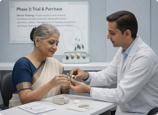 Performance Confirmation: Overall satisfaction is assessed through comprehensive testing, reviewing hearing clarity, comfort level, ease of use, and how well devices meet your expectations in real-time. Once the performance of the hearing aids is confirmed through thorough fitting and testing, purchases can be completed immediately.